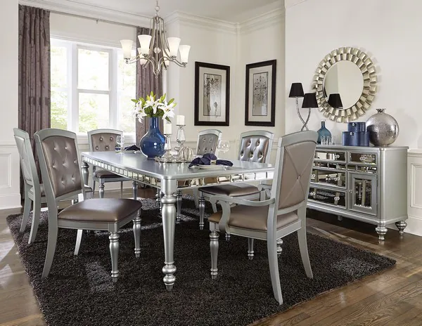 Casting a glamorous reflection of your personal style, the Orsina Collection will dazzle your friends and family as they enter the sophisticated dining space you have created. A sparkling silver finish enhances the mirrored table apron and fronts of the server while the pearl bi-cast vinyl of the accompanying chairs lends elegant contrast. Crystal button tufting lends additional sparkle to the collection. The server provides ample drawer and behind door storage allows for the safe keeping of your tabletop accessories.