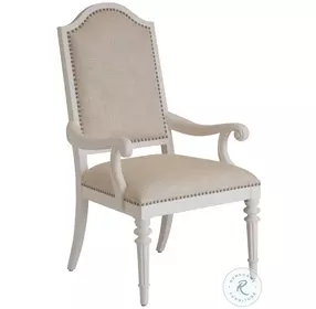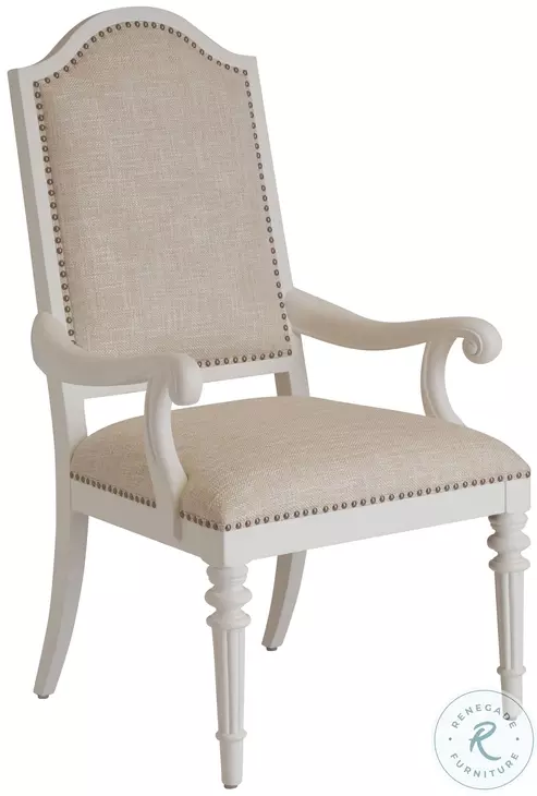 - Chair features white finished frame, marbella fabric finish, upholstered in performance fabric, Fabric Content: 74.5% Viscose, 13% Linen, 12.5% Cotton, basket weave pattern fabric, turned fluted tapered legs, decorative nailhead trim in pewter finish