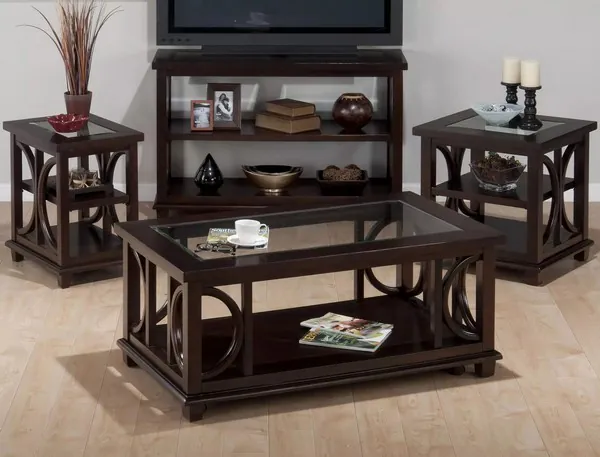 Choose the occasional pieces from the 966 Panama Brown collection for a chic, stylish way to accent your living room decor. End table, chairside table, coffee table, and sofa table feature a cool modern design with concentric circle wood lattices and beveled glass table tops. This collection is comprised of sturdy tempered glass and hardwood solids with cherry veneers, guaranteeing furniture that can stand up to the trials of daily use.