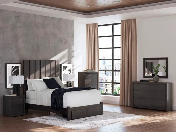 Find serene simplicity in the clean lines and dark neutral tones of this king panel bed. It’s a sincere approach to modern elegance, giving you high style at a great value. Vertical planks decorate the generously scaled headboard to give the illusion of additional height, polishing off the piece in grand fashion.