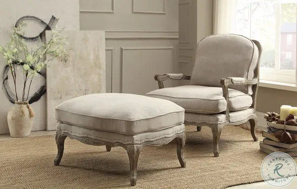 Delicate carvings and a woven rattan back grace the show wood frame in the Parlier Collection. The enhanced texture of the wood grain is highlighted by a gray weathered finish, while a natural color fabric covers the plush feather down seating in this elegant offering. The available coordinating ottoman allows for the achievement of ultimate relaxation.