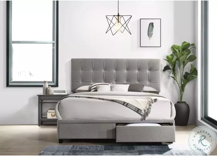 The Picket House Furnishings Pasadena Queen Platform Storage Bed brings style and functionality to your room! Crafted from sturdy plywood and upholstered all over for a plush and modern aesthetic. The headboard is upholstered in soft, polyester with decorative tufting perfect for a modern space. Includes eight slats and four support legs underneath your mattress to provide lasting comfort for up to 800 pounds. Two drawers are built into the footboard to provide convenient storage for your clothing or favorite blankets. What makes this bed even better is that it ships in one convenient and easy to handle box. Upgrade your space with the Picket House Furnishings Pasadena Queen Storage Bed. Available in two colors, oak white and grey.Features