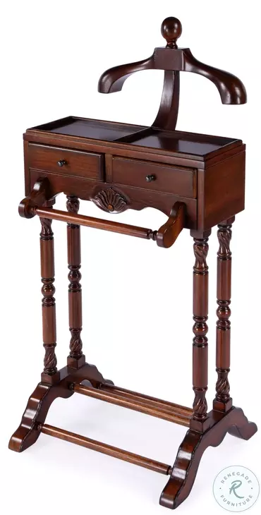 This elegant valet is a must for anyone with a flair for fashion. Handcrafted from solid hardwood, it features a sculptured wood hanger, ideal for a jacket, shirt, or blouse, as well as a pants hanger, two drawers, and a top storage shelf.Features