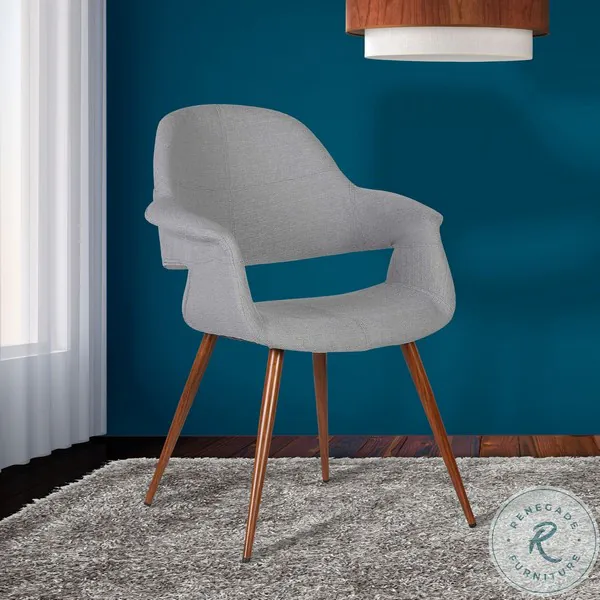 The Armen Living Phoebe contemporary arm chair is a well proportioned, unassuming, and yet simply elegant addition to your modern dwelling. Add some color to your home with this bold and stylish mid century designed dining chair. Upholstered in textured fabric over a hardwood frame and complete with a generously cushioned seat and back, the Phoebe is the epiphany of comfort and style. This brilliant chair also features padded armrests for further relaxation. Its walnut wood finished metal legs further enhance its mid century appeal while assuring durability. The Phoebe is available in Gray, Green and Orange Fabric upholstery.