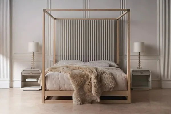 Pinstripe Light Sun Drenched Oak And Almond Milk King Canopy Bed