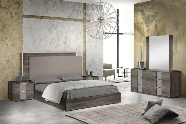 The Portofino Bedroom collection by JNM Furniture is a first of its kind, skillfully blending the case goods with a touch of upholstery. This Bedroom Collection features a beautiful tufted beige velvet on the headboard as well as accompanying case goods. The double headboard design highlights the duality and harmony between the Canyon Oak lacquer and the beige velvet. This blend of materials creates the most appealing effect, further elevated by the chrome accented legs. The quality of materials and construction truly highlight the best of Italian craftsmanship.