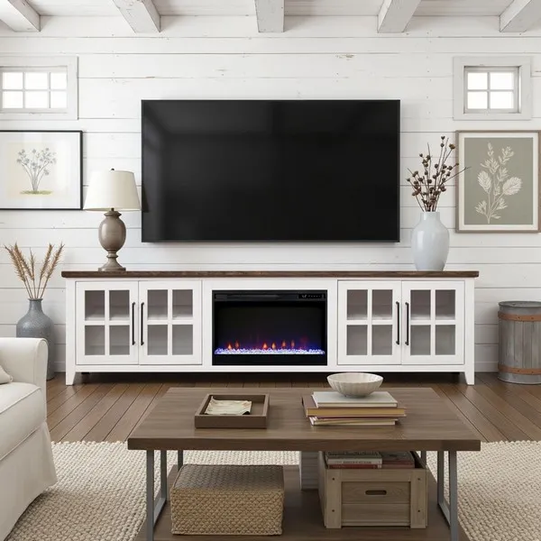 Providence White and Bourbon 96" TV Stand with Fireplace