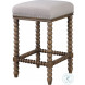 A casual statement counter stool featuring spindle turned legs and carved trim finished in a light walnut stain. Plush seat is tailored in a beige linen blend fabric with added performance treatment to resist soiling and stains, accented with brushed nickel nailhead trim. Seat height is 26".Features