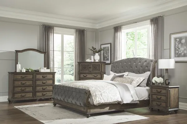 The balance of rusticated accenting and elegant form is exquisitely achieved in the design of the Rachelle Collection. Serving as the focal point of the collection the stately sleigh bed presents an elegant profile for your bedroom, with its gray velvet-covered, rolled, padded headboard and footboard defined by button tufting, nailhead accent and wood framing. The traditionally styled case pieces feature classic appointments such as turned feet brown-finished metal drop hardware, egg and dart molding and rounded pilasters. The knotty pecan wood veneer features a weathered pecan finish further lending to the classic look of the collection.