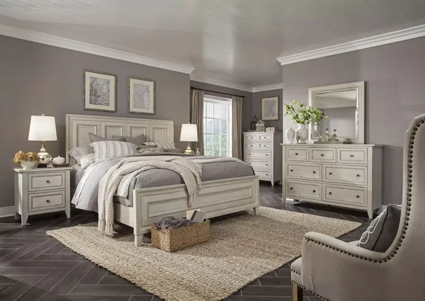 A fresh Weathered White finish on cathedral ash veneers and hardwoods contrasts simple Weathered Bronze pulls to create timeless comfort in Raelynn. Climb into the clean and crisp feel of gorgeous Irish linen in the perfectly tailored panel bed which showcases the beveled panel and bead moulding detail that classifies this collection as updated Shaker. Traditional and transitional at once, Raelynn is the ideal cottage collection that is equally as at home in the suburbs.