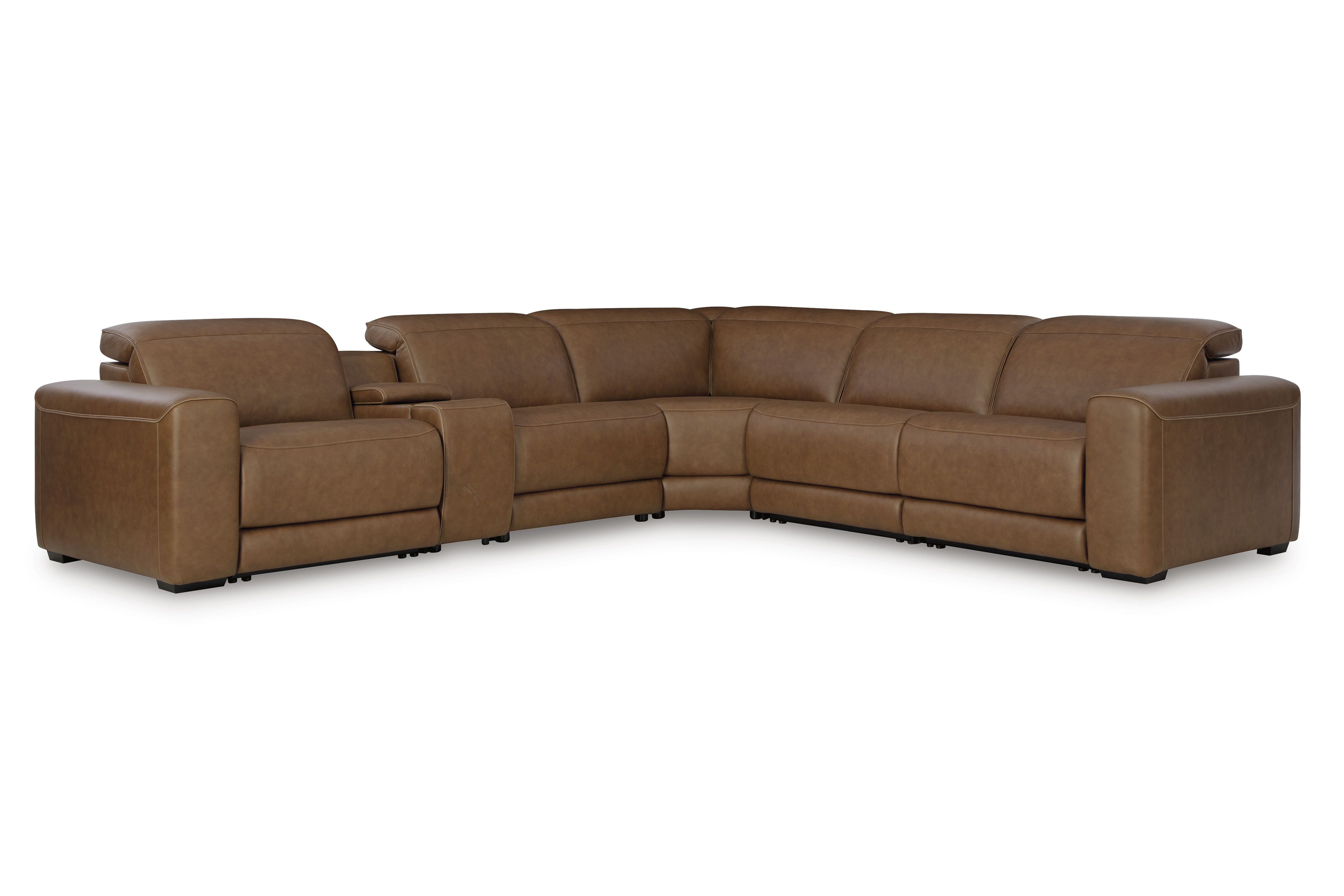 Sleek and streamlined, this contemporary power reclining sectional with console is ready to sweep you off your feet. Its plush, divinely comfortable cushioning is wrapped in decadently soft leather and faux leather upholstery. The push of a button doubles your relaxation, reclining your body and adjusting your headrest to infinite positions. You can rearrange the sectional's pieces whenever you please, thanks to its versatile modular design. Pop-out cup holders and wireless charging complete the luxurious lounging experience.