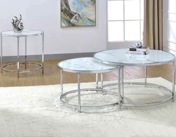 Experience an elegant interplay of flowing shapes with faux marble glass and chrome in the nesting sets of Rayne occasional collection. The nesting cocktail table adds an interesting multi level dimension to any living room area that you will wonder how you lived without. The nesting cocktail table gives you more storage or display area as well as something interesting to behold.