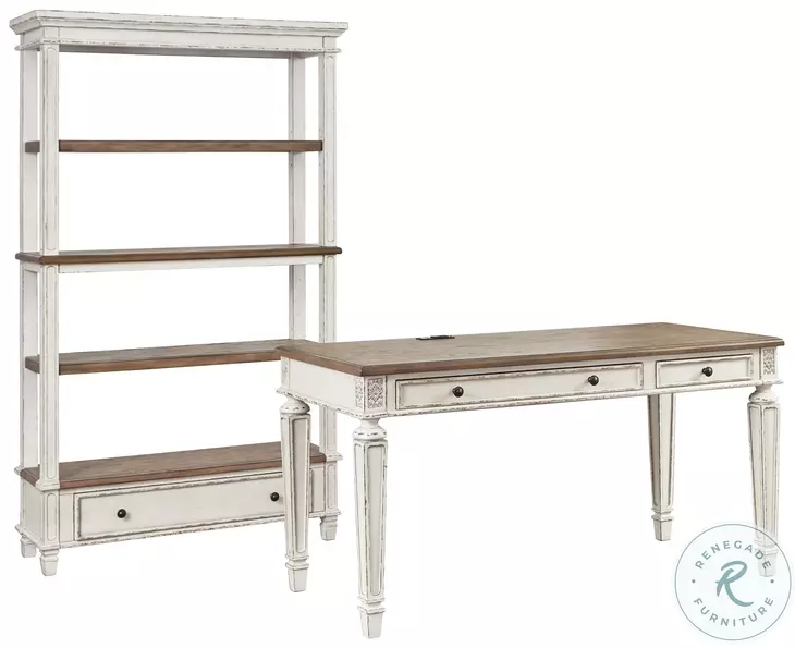 Elevating the art of traditional cottage styling, this bookcase is your heavenly home office realized. Antiqued two-tone aesthetic blends a chipped white with a distressed wood tone top for added charm. Clever balance of shelf and drawer space beautifully works.Features