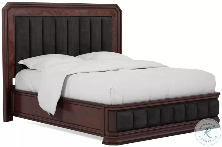 Indulge in the timeless elegance of our Revival Upholstered Bed and create a space where you can relax and rejuvenate in style. Meticulously crafted with attention to detail, this bed is a luxurious centerpiece for your bedroom sanctuary. The headboard and footboard of this bed feature sumptuous upholstered channeled panels, upholstered in decadent charcoal velvet fabric. Not only does this provide a plush and inviting feel, but it also adds a touch of opulence to your sleeping space, while the rich Napa Mahogany finish adds warmth and depth to any bedroom décor.Features