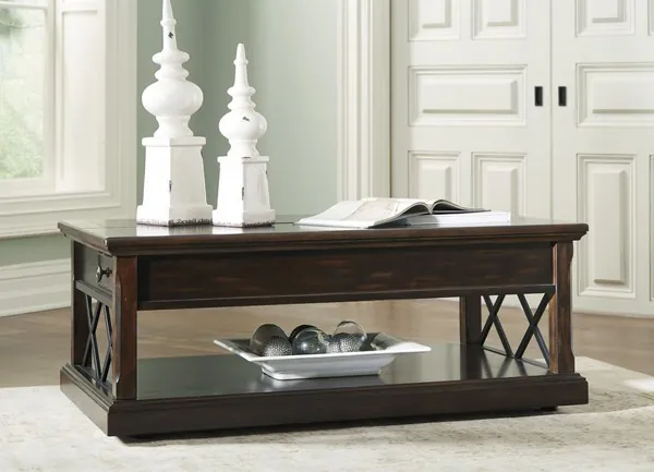 The beauty of the Roddinton coffee table will immediately engage you. The octagonal shape is a rare find and an ideal fit among traditional and sectional seating. Soft black undertones highlight the warm finish. Shapely turned pedestal legs are poised between the tabletop and lower shelf.