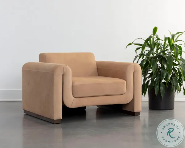 Cozy and luxuriously smooth, the Romer Armchair brings a sense of warmth and comfort to any living area. Expertly designed with sculpted curves that lend a modern aesthetic. Upholstered in nubuck cocoa leather with metal accents on the legs. Handle with Care: This design has been crafted with 100% leather. Leather is a natural material; as such, colour variations, markings, wrinkles, grooves and light scratches are acceptable and appreciated characteristics. No two pieces are alike.