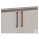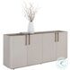 Bring graceful modernity to your living space. This contemporary sideboard showcases beautiful and gentle curves, enhanced by a cream faux leather upholstery. The brown oak veneer top is designed to captivate. Offering ample enclosed storage with four cabinets and a sturdy rustic bronze steel base, it's a stylish and functional piece. Consider the coordinating console table, desk, media console, and cabinet for a complete look. Please handle this item with care, and appreciate that the faux leather is manufactured to emulate natural leather, which means you may observe color variations, markings, wrinkles, grooves, and light scratches, all contributing to the unique character of each piece.Features