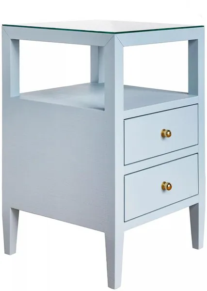 With its sophisticated form and subdued texture, the Roscoe Collection brings style and elegance to any room. Two drawers with petite polished brass knobs sit elegantly beneath an open storage shelf. Finished in textured light blue linen, it's the perfect accompaniment to your favorite chair. Roscoe comes with a removable glass top and soft close glides.