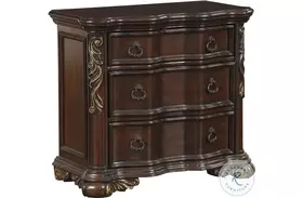 Grandly styled for the traditional home is the Royal Highlands Bedroom Set. Prominent decorative scrolling adorns the headboard while heavier carved scrolling accents the pilasters and feet of each piece in the collection. The substantial wood framing of the bed creates a distinct serpentine profile that carries into the design of the case pieces. Brown bi-cast vinyl provides complementing contrast to the rich cherry finish. Traditional cherry and birch veneers accenting furthers the elegant presentation of the Royal Highlands Collection.Features