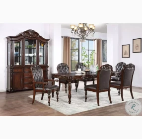 Distinctive British Colonial designs are evidenced on the carved Mahogany dining room set. The additional two leaves allow comfortable seating for ten.Features