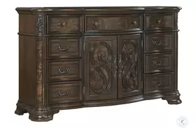 Elegant, traditional styling in a grandly scaled bedroom collection, Royale offers all the essentials of modern life in a package that honors designs from antiques past. Olive ash burl accents combine with a deep, brown cherry finish in a truly opulent presentation.Storage items include a Lift-Top Chest with valuable hidden storage, Dresser & Mirror and Nightstand with USB charging ports.