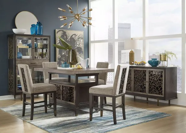 Distinctive in every way, the Ryker dining collection offers a refreshing take on dining in style. Its unique character combines a stunning mix of materials, including wood, metal and glass. It features a Nocturn Black and Coventry Grey finish that highlights its strong contemporary profiles and is accented with both clear glass and black glass. A signature fractal pattern design element highlights select pieces and gives a distinctively modern edge to the group while metal ferrules in Aged Brass add a finishing touch to the legs. With exceptional beauty and comfort, Ryker is perfectly suited to take a dining room from unremarkable to truly remarkable.
