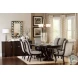 Sophisticated soft contemporary design is achieved in your dining room with the addition of the Savion Collection.Two table types are offered as versatile options to fit in your space a rectangular double pedestal table and an oval single pedestal table.Both featuring a distinct birdcage style base.An espresso finish highlights the unique veneer pattern.Dramatic flair is lent to the design by the accompanying chairs. Neutral tone fabric covers the substantially sized roll back arm and side chairs.Reeded fronts on the server along with the serpentine profile further the elegance of this distinctly sophisticated collection.