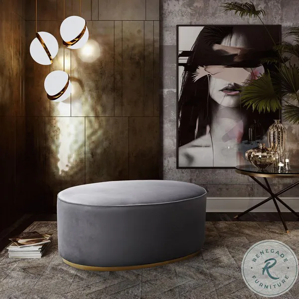 Offering a fresh, contemporary style this large oval shaped ottomans features a glimmering gold steel base and is enveloped with sumptuous velvet upholstery. These glamourous ottomans pulls double duty as extra seating or as a footrest. Available in your choice of blush, grey, or navy velvets the Scarlett ottoman provides comfort, durability, and style.