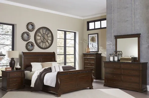 Transitionally styled with a burnished brown finish, the Schleiger Collection features bold accenting and functional storage options. Sturdy legs support the metal and rivet banded table top with chair and bench options, allowing for versatile seating configurations. Metal and rivet banding with nailhead accent also features prominently on the open hutch and buffet, and mobile kitchen cart.