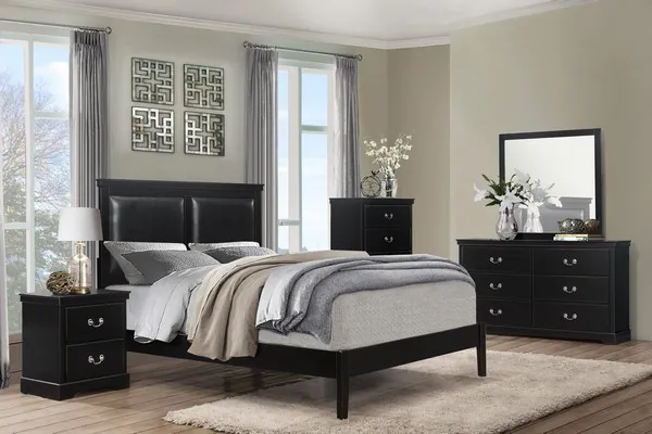 Merging traditional and transitional design creates the look of the Seabright Collection, providing a unique platform from which to style your bedroom. The black painted finish allows for exceptional versatility of placement and decorative inspiration. The bed features framed, color coordinated, dual faux leather padded headboard inserts and an ultra low-profile footboard. The traditional styling of the high polish chrome bale and pull hardware lends to the classic profile.