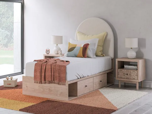 Shapella Tan And White Twin Upholstered Panel Bed with Storage