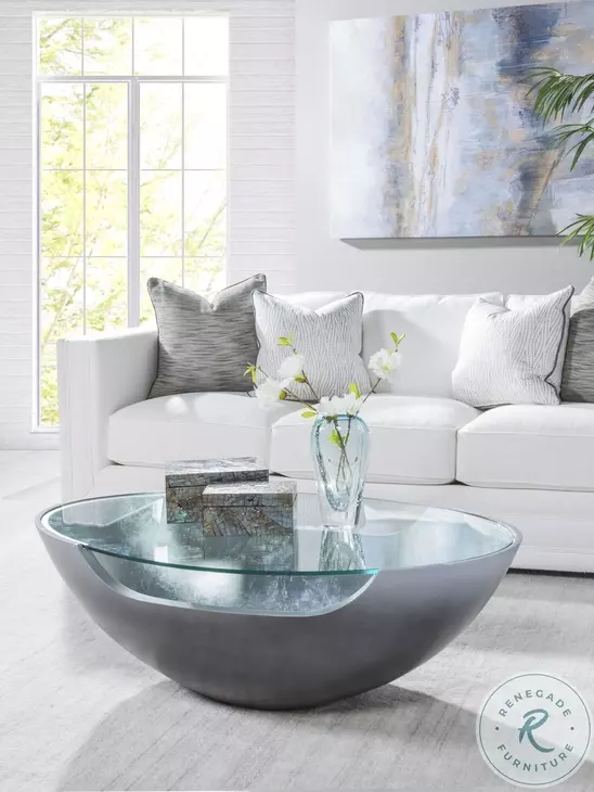 Modern, organic casted design with a smooth a exterior in a silver gray with ombreé effect, contrasted against an interior in silver leaf, with inset tempered glass top and an oval bowl-effect bottom.Features