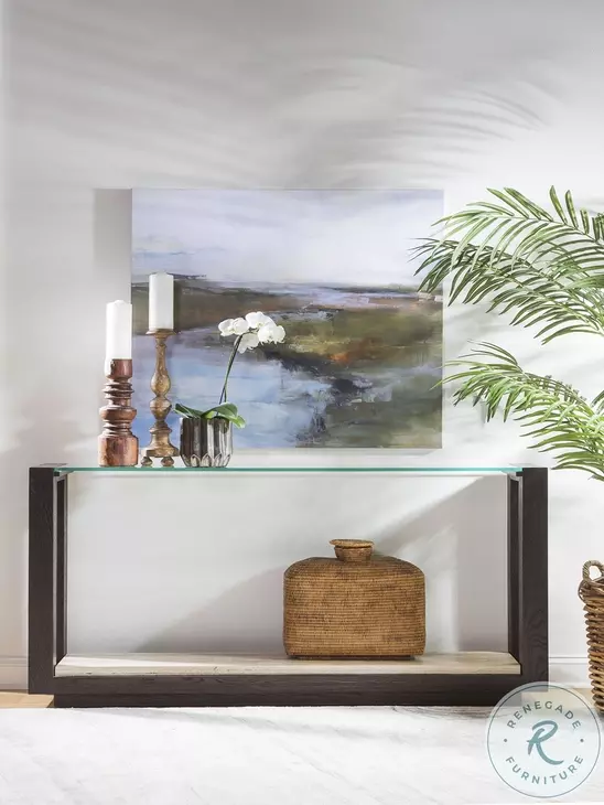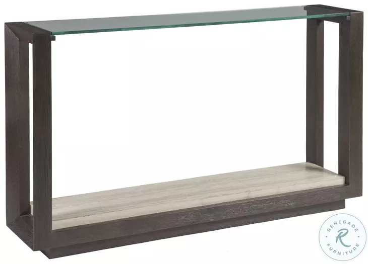Contemporary design crafted from select hardwoods and flat-cut oak veneers in a heavily sandblasted rich mocha brown coloration with a satin sheen. Features an inset tempered glass top, a Fantasy travertine shelf, and a recessed plinth base. Fantasy travertine is a product of nature and will vary in appearance and coloration from piece to piece.Features