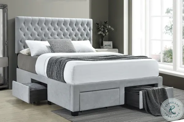 Soledad Collection from Coaster Furniture. Storage bed upholstered in fabric. Features four storage drawers. Button tufted headboard. Asian hardwood and MDF frame.
