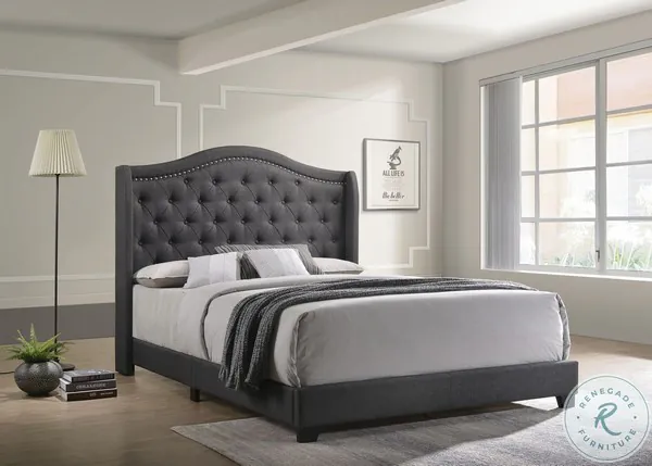 Sonoma Collection from Coaster Furniture, Camel back headboard with button tufting. Individually driven brushed nickel nailhead trim. Plywood and MDF frame. Box spring required. Available in blue, grey, and beige fabric