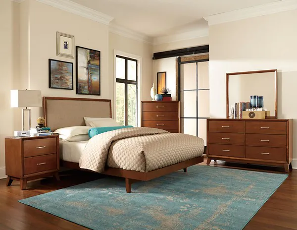 Hints of retro styling lend to the contemporary style of the Soren Collection. Clean lines give way to slightly angled legs on each piece of this modern bedroom suite. The silver hardware that adorns the drawer fronts serves to highlight the light cherry finish. The padded neutral tone fabric insert of the headboard provides a natural complementary accent to the collection.