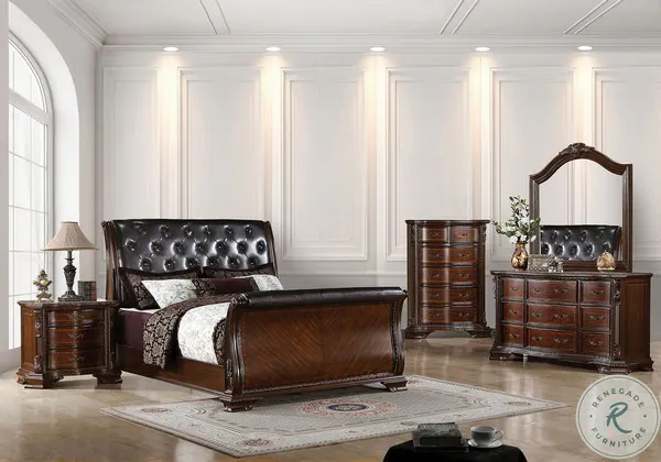 Beautiful baroque style carvings in a deep brown cherry finish are hallmarks of this exquisite bedroom suite. The sleigh bed has a button tufted leatherette Headboard and footboard, with elegant bracket feet. Each matching case goods has antique brass hardware and elegant carved accents.