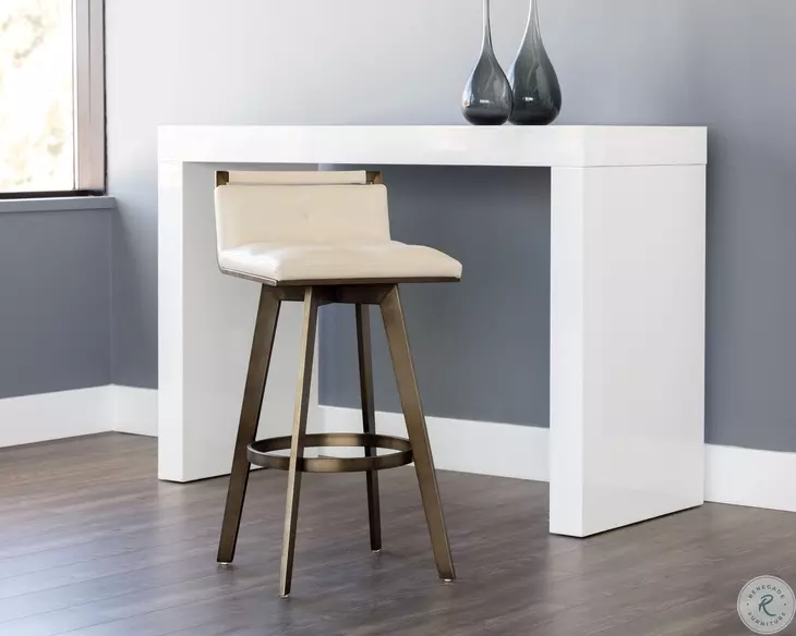 Experience the stylish swivel of this Art Deco inspired barstool from our Stafford collection. Its design features a low-profile seatback and a partially exposed stainless steel frame and legs with an elegant antique brass finish. The 360-degree swivel with a 180-degree return offers ease of movement. Ideal for residential and commercial use.Features
