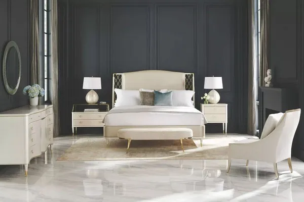 Star Of The Night Collection from Caracole Furniture. Fit for a fairytale, the collection features an ornate metal trellis with starry details, inspired by delicate beading on the bodice of a ball gown. Dressed in a shimmering silver vinyl thats easy to keep looking pristine, the subtly curved headboard, foot, and side rails are beautifully balanced by a wood frame and tapered feet in a pearlescent Stardust finish. Metal ferrules in a Whisper of Gold add a luxe note.