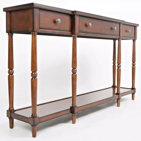 Add a touch of elegance to your hall, entry way, living room, or any room short on space. At only 15 inches deep, these consoles are an excellent display and storage solution to narrow or tight areas. Available in White, Light Walnut, and Antique Mahogany finishes.