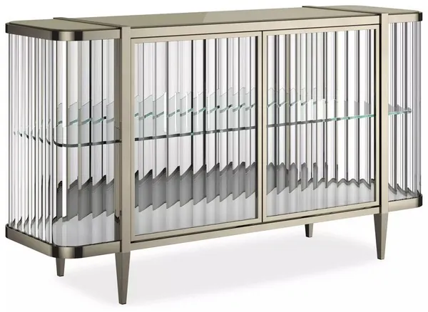 It’s true, this console is so extraordinary, you can’t help but Stop And Stare. It’s an instant source of brightness and reflectivity that creates a natural focal point. A wavy acrylic exterior mirrors the undulating patterns of sand and sea while its top adds another layer of organic splendor. The mirrored interior back and bottom panels are designed to reflect light as it pours in from every angle as well as mirror the beauty of the treasures you display. Glass shelves ensure unobstructed views as do its touch-latch doors with concealed hinges. A Whisper of Gold finish outlines its rounded silhouette and four tapered feet, imparting the overall luxe feeling of a diamond in a platinum setting.