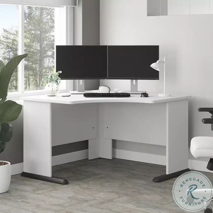 The Bush Business Furniture Studio A 48W Corner Computer Desk combines a fresh, contemporary appearance with the commercial quality construction needed to withstand years of everyday use. Conveniently designed to be placed in a corner of your choosing, this compact desk is a perfect choice for working or gaming in areas where space is limited. Set up with a computer and all your equipment on a durable thermally fused laminate desktop that supports up to 200 pounds. A built-in wire management grommet keeps cords and cables in order so the surface remains free from unnecessary clutter. The base features adjustable levelers to compensate for uneven floors, and wall attachment hardware is included along with the stable design for maximum safety and security in any home or professional office. Find the right look for your space with three contemporary finish options: White, Storm Gray and Platinum Gray. This small corner desk has been meticulously tested to meet or exceed ANSI/BIFMA quality standards for safety, durability and performance and is backed by the Bush Business Furniture 10 Year Manufacturer’s Warranty. Upgrade your office as needed with a Studio A Storage Cabinet, File Cabinet and Bookcase (coordinating items sold separately). American made with U.S. and imported parts.Features