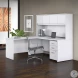 Choose this Bush Business Furniture Studio C L Shaped Desk with Hutch for a comfortable design that works with you for years and a fresh finish that looks great anywhere. With a thick surface, an extended modesty panel and clean lines, the L Shaped Desk conveys a classic look but adds a contemporary White or Storm Gray finish to meet the style needs of the modern workspace. The thermally fused laminate finish, durable edge banding and sturdy end panels resist scratches, stains or dents while standing up to the rigors of a 40-plus hour work week. Keep pesky computer cords out of your way with the cable management system for an organized work surface. The 42W Return attaches to either side of the Desk to form a left or right handed L Shaped layout. With 4 doors featuring self-closing Euro-style hinges, the Hutch conveniently stores office supplies, books and more. The 3 Drawer Mobile File Cabinet rolls with you throughout your office or remains in place as needed on any surface. This contemporary office furniture comes with a 10 Year Warranty and meets ANSI/BIFMA quality test standards. American made with U.S. and imported parts.Features