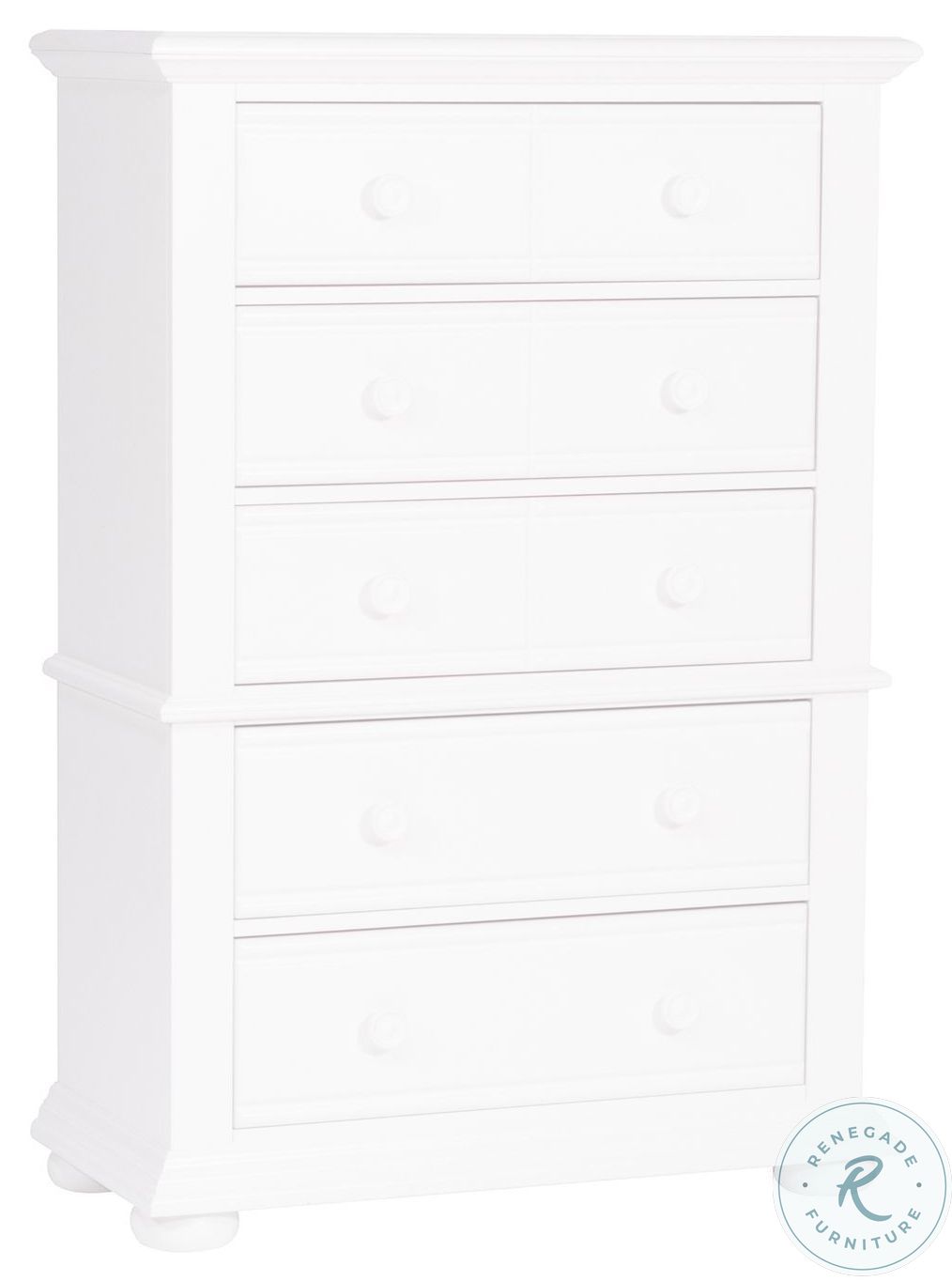 Obtain a fashionable cottage look with the summer house chest. Crafted with poplar and pine solids with wood products, this piece features 5 drawers, bottom case dust proofing, felt lined top drawers, and fully stained interior drawers. The oyster white finish is accented by wooden knob hardware.Features