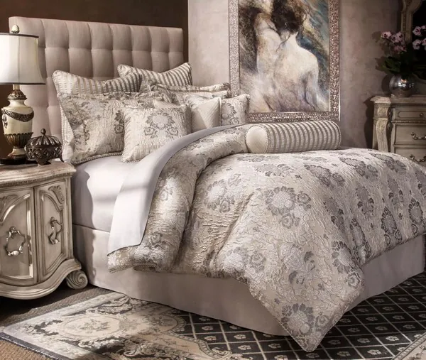 Enhance your sophisticated style with the Sycamore Grove comforter set. Defined by tones of warm ivory and soft gray, this look showcases jacquard fabrics that are puffed from a special weaving process that adds dimension and drama. The pillow shams are designed with a tailored flange and are finished with the same twist cord thats seen throughout the set. The coordinating stripe and diamond fabrics on the decorative pillows balance the patterns and tie the whole design together perfectly. These decorative pillows also have feather fill and removable covers for ultimate convenience.