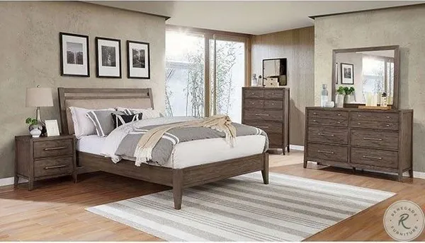 Tawana Collection from Furniture of America. A linen like fabric padded headboard highlights this bedroom set with a pronounced warm gray wood grain finish. The casegood pieces has a classic squared motif that not only makes a great fashionable statement but it adds a sense of sophistication as well.