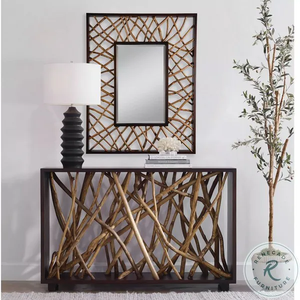 The Teak Maze Console is sure to make a statement in any space. This beautifully unique piece is constructed from solid mahogany wood in a rich walnut stain with natural gathered teak branches artfully arranged within the frame.
