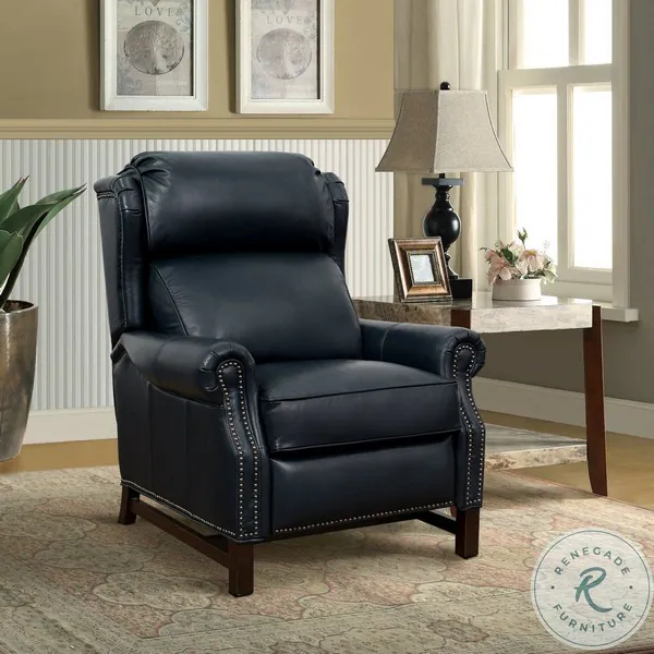 Thornfield Collection from Barcalounger. Classic wing back lounge chair recliner with 3 way push thru the arms mechanism and footrest extension. Shaped knee back rolled arms and pleated wings are accent with nail head trim. Adjustable semi attached zippered pub back and welted boxed loose seat cushion with pocketed coils and down blend feather wrap provides unsurpassed seating comfort. Chippendale hand carved base is finished in a reddish-brown merlot finish.