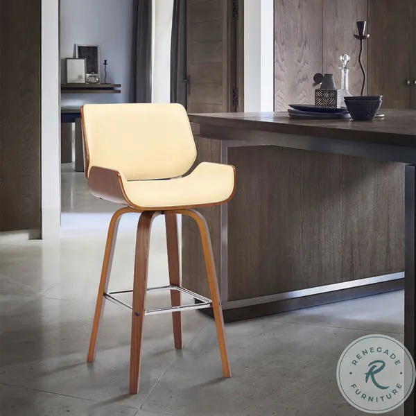 The Armen Living Tyler mid century barstool is a standout in any contemporary household setting. The Tylers beautiful walnut wood frame is perfectly accented by its faux leather upholstered seat and back. The Tyler is wonderfully versatile, sporting a stylish yet practical appearance as well as a 360 degree swivel function for exceptional mobility. The Tyler is available in 26 inch counter and 30 inch bar height with brown faux leather. Excellent choice for a contemporary dining setting.