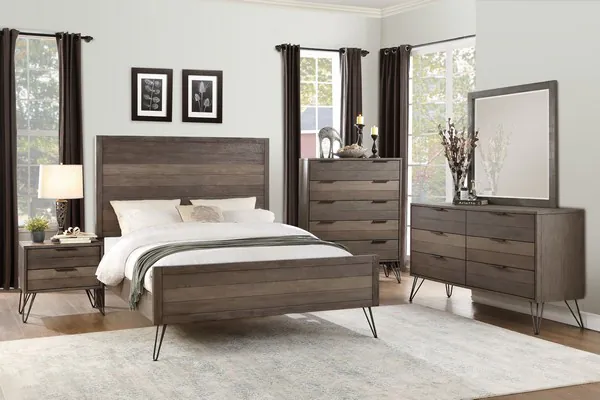 Perched atop metal legs, creating a dramatic statement of contemporary styling, the Urbanite Collection is a perfect reflection of your modern style preference. The solid acacia wood with acacia veneer is highlighted by a 3-tone gray finish that allows the variance of the natural grain to shine. The horizontal slat design as well as metal pull tab hardware lend to the clean, contemporary look of the collection.